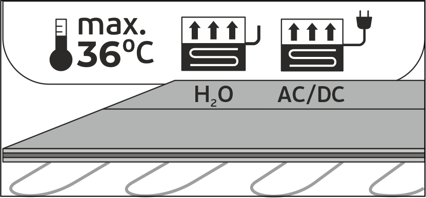 При использовании системы напольного водяного или электрического отопления учитывайте, что максимальная температура нагрева на поверхности кварцевого ламината не должна превышать +36°С, а напольное покрытие установлено и эксплуатируется в соответствии с требованиями производителя.
