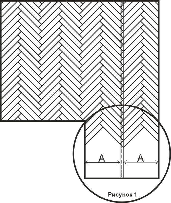 Например, если важна симметрия при укладке вдоль узкого коридора, то необходимо нарисовать две линии, которые зададут центральную ось. Линии размещают на равном расстоянии «А» от стен коридора, таким образом задавая симметрию (Рис.1). В зависимости от сложности геометрии помещения возможно разнообразное размещение центральной линии и привязки рядов укладки. Старайтесь не оставлять слишком маленькие элементы вдоль стен. Для их стабильной эксплуатации или при невозможности установить их из-за помех, мешающих закрыться замковому соединению, можно производить срезку замка с последующим нанесением клея для фиксации элементов с основной массой пола.
